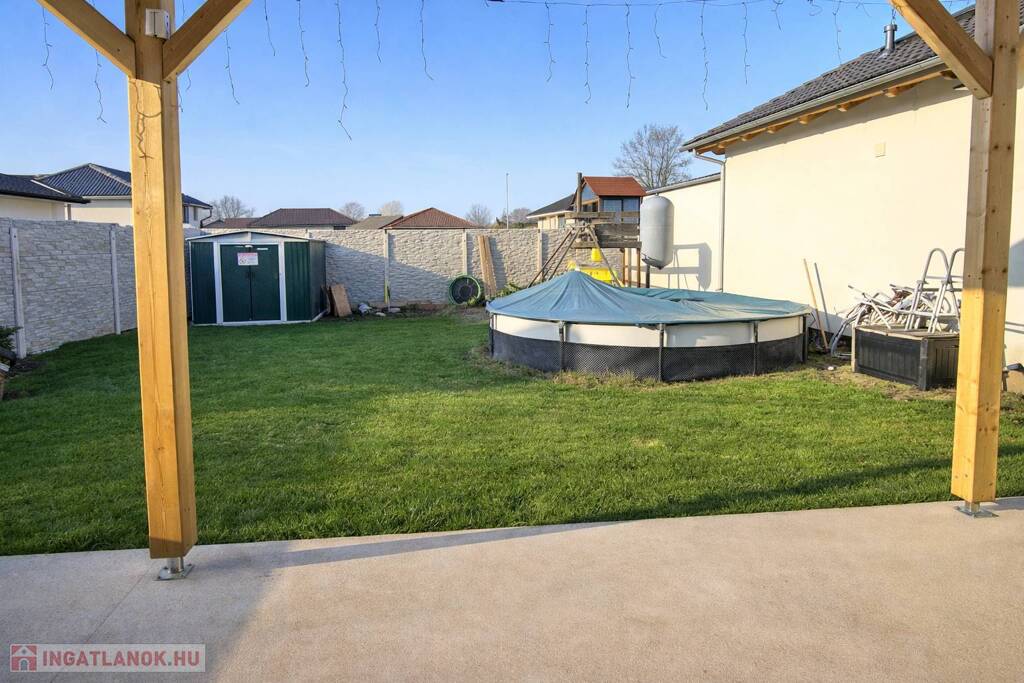 A kert hátsó részén egy kényelmes, jól kihasználható, biztonságos, zárt, füvesített saját kert van, ahol minden gyermekjáték, medence elhelyezhető.