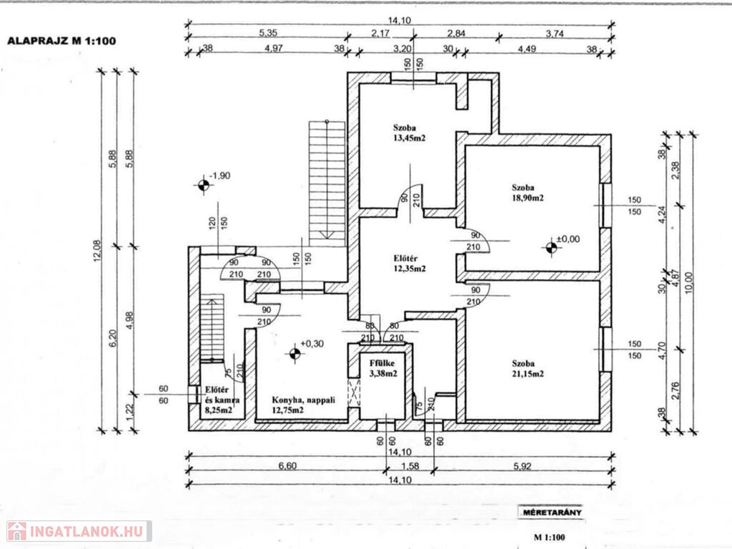 EMELET helyiségei (90,23 m2) : 4 szoba ( 13,45 m2, 12,35 m2, 21,15 m2, 12,75 m2) előszoba 12,35, konyha 3,38, előszoba 8,25 m2, előtér 8,25 m2, dolgozó szoba.