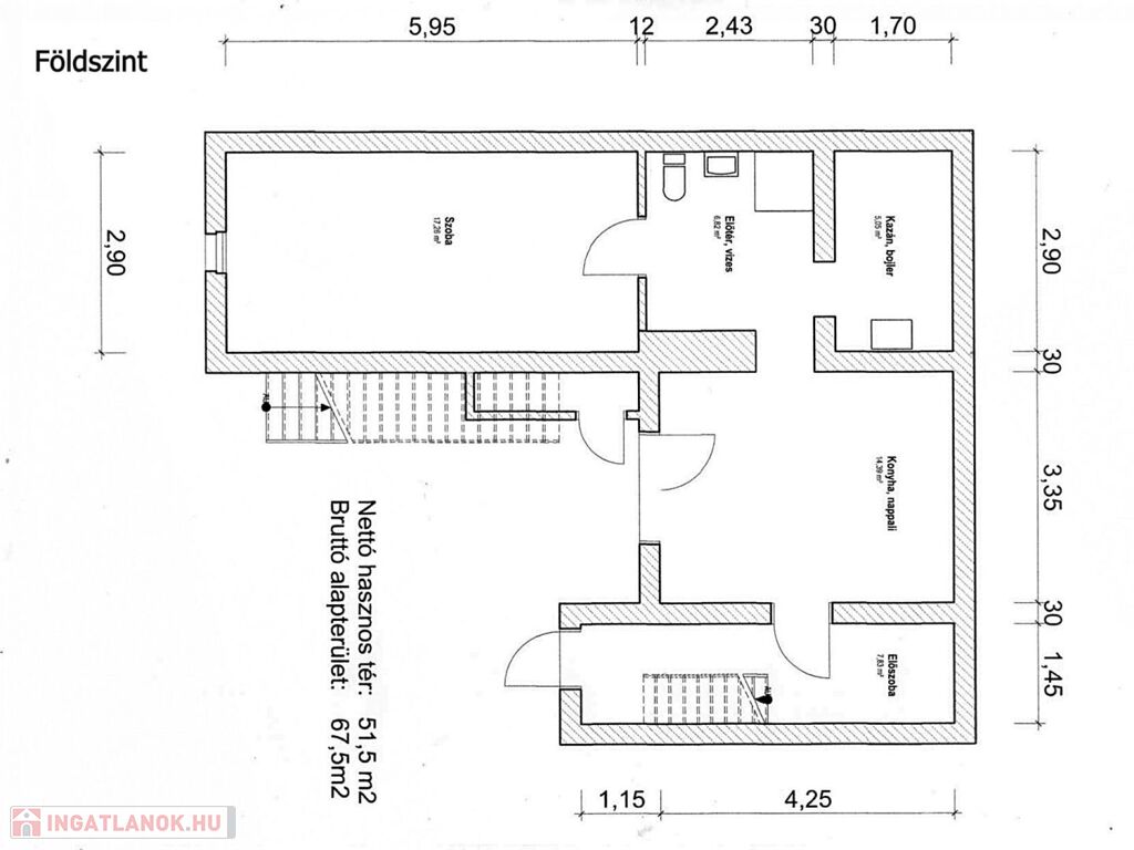 FÖLDSZINT ( 51,5 m2) helyiségei: 14,39 m2 Konyha-nappali, 6,82 m2 fürdőszoba, egy 17,26 m2-es szoba, 5,05 m2 kazánház. A földszintről a lakáson belülről egy előszobából is vezet lépcső az emeletre.
