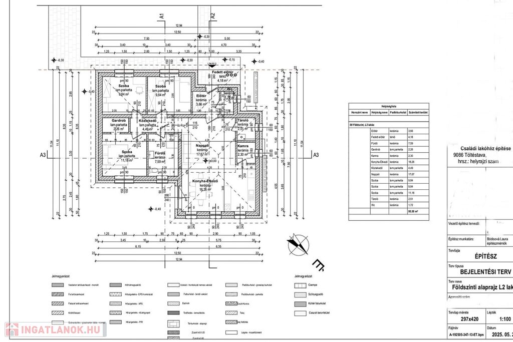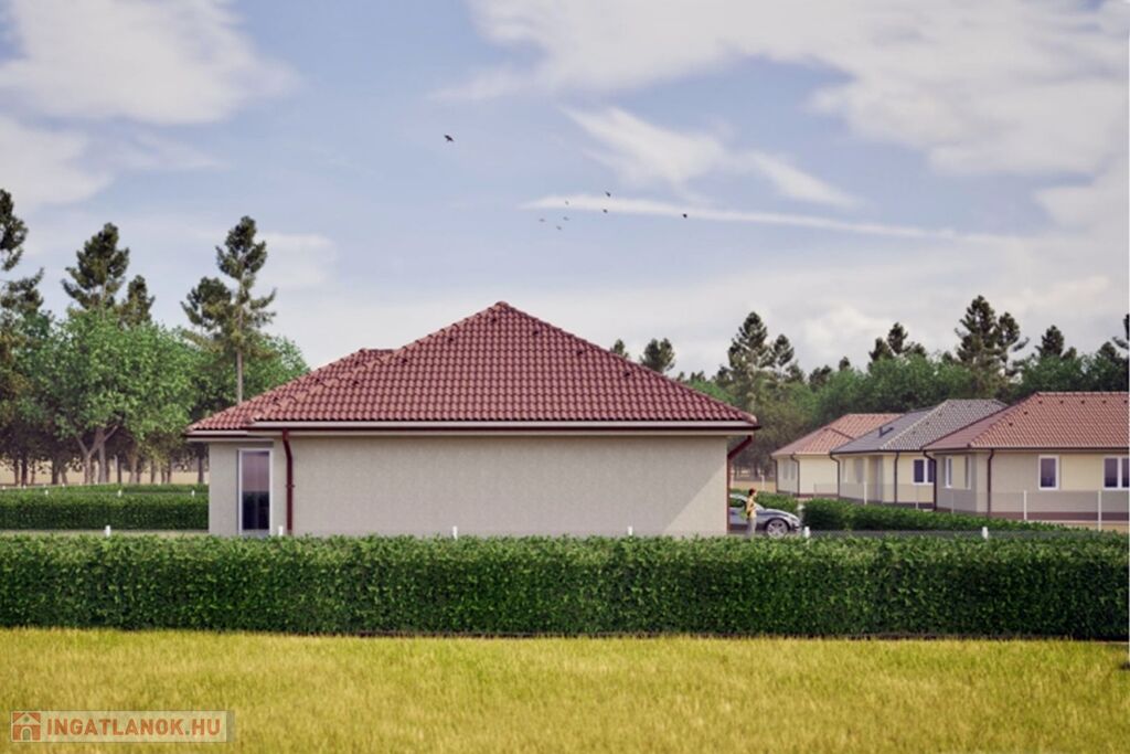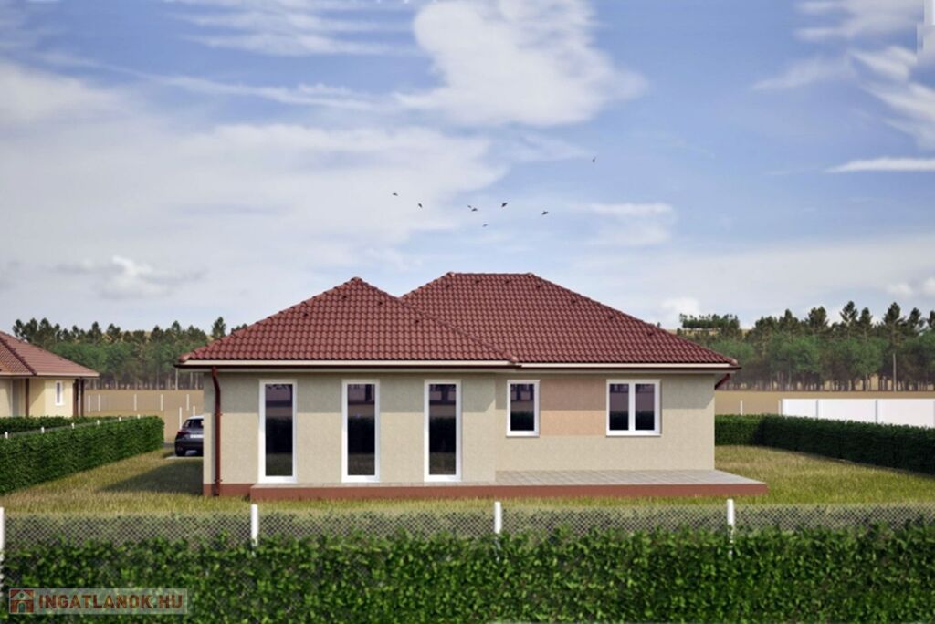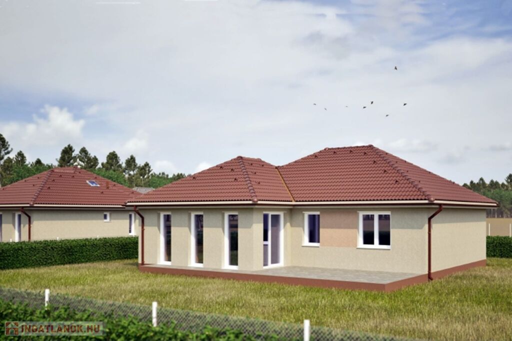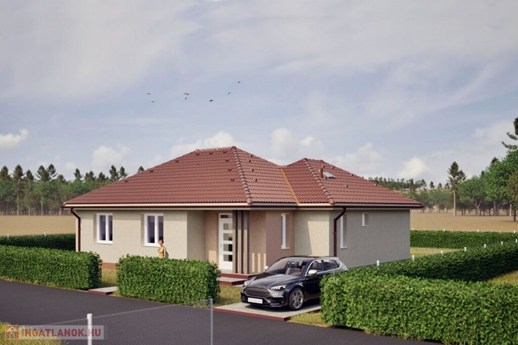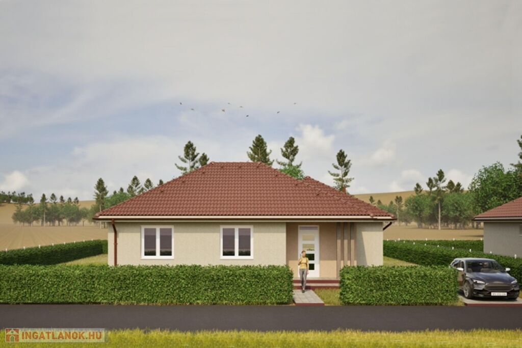 A ház helyiségei: amerikai konyhás nappali, 3 hálószoba, fürdő WC-vel, külön WC, kamra, háztartási helyiség, tároló, gardrób, előszoba, közlekedő, előtér, fedett előtér.