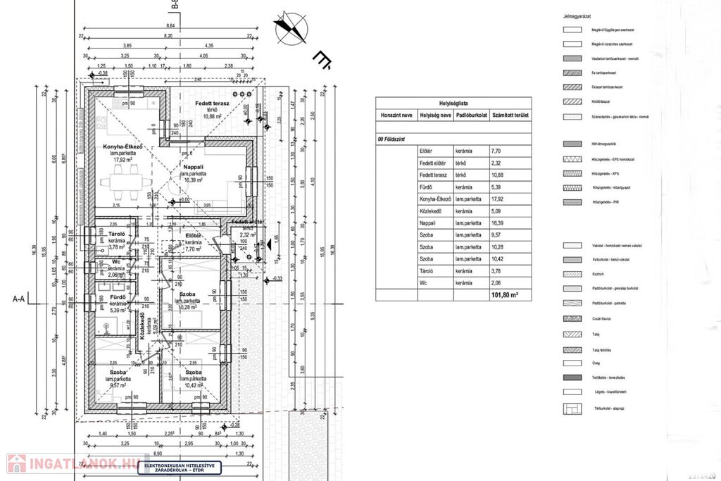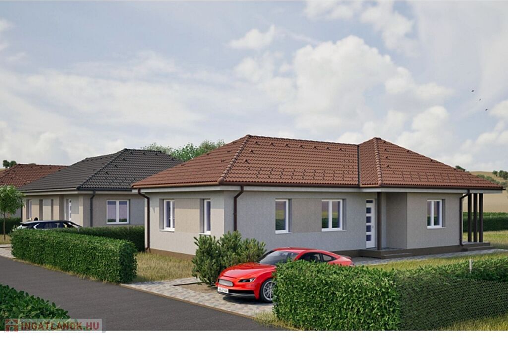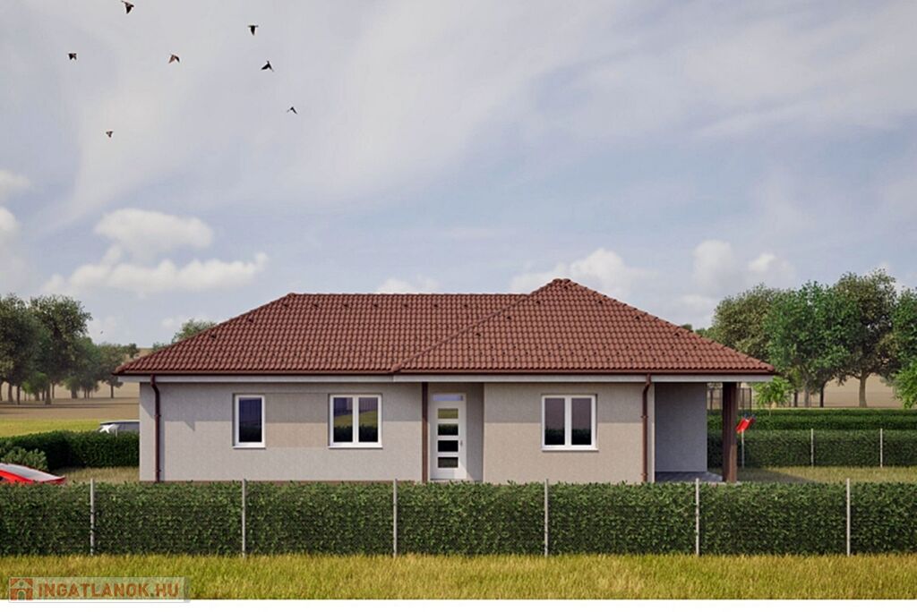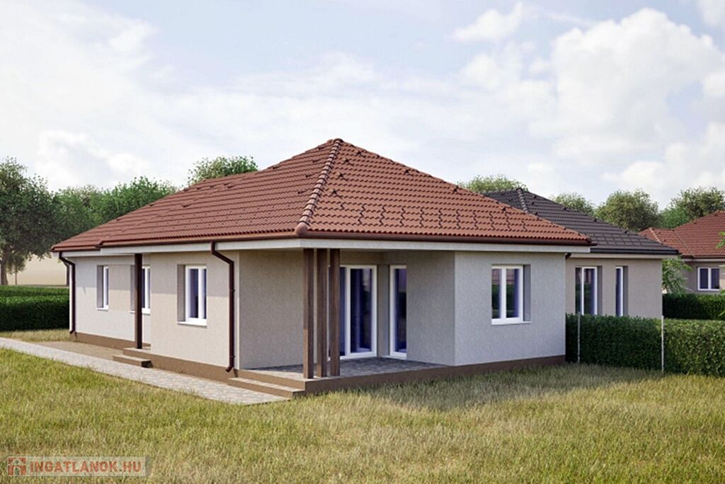 A ház helyiségei: amerikai konyhás nappali, 3 hálószoba, fürdő WC-vel, külön WC, kamra, tároló, háztartási helyiség, előszoba, közlekedő, fedett előtér, 10,88 m2 FEDETT TERASZ.