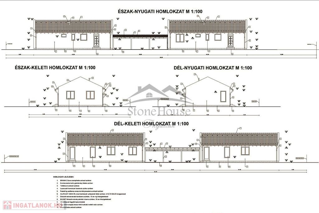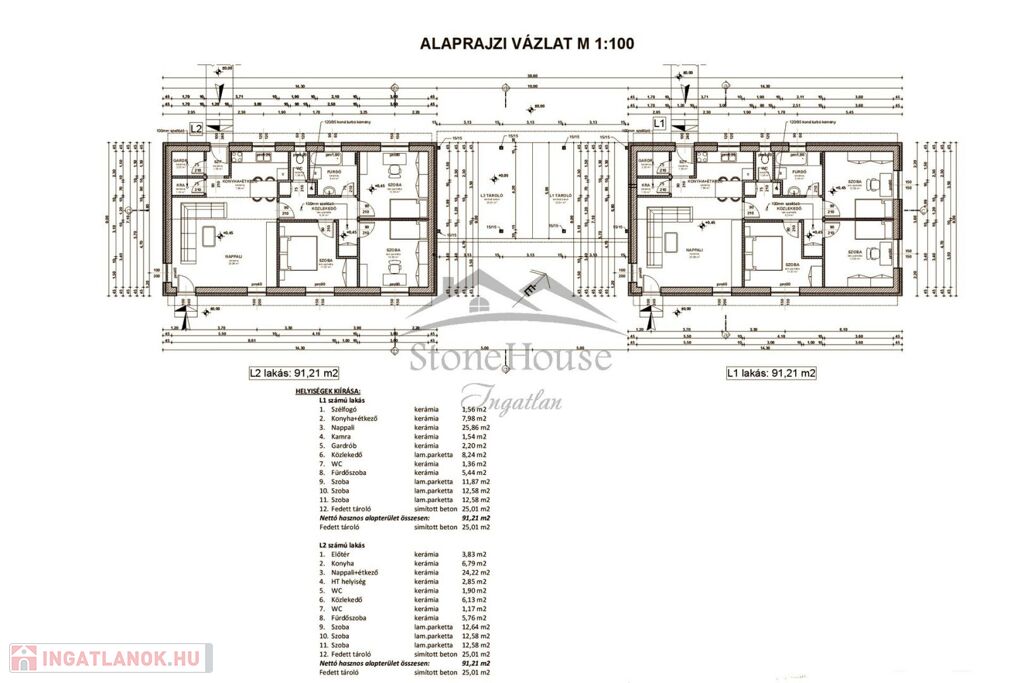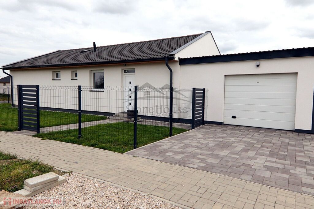 A 91,21 m2-es ház helyiségei: amerikai konyhás nappali, 3 hálószoba, fürdőszoba, WC, 2 gardrób, közlekedő, kamra, szélfogó. Az épülethez tartozik egy 15 m2-es terasz és egy 25 m2-es GARÁZS.
