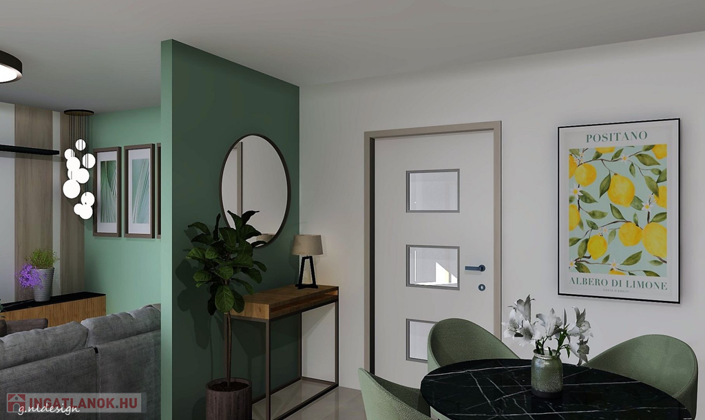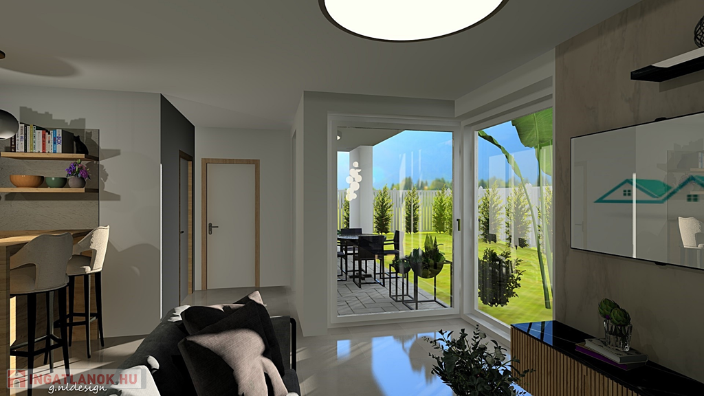 A lakás alapterülete összesen 55,93 m2, amelyhez egy 9,33 m2-es terasz tartozik. A lakáshoz tartozik még egy térkövezett, zárt udvari kocsibeálló is. A lakás helyiségei: hatalmas étkező-konyha, nappali, 1 hálószoba, fürdő, WC kézmosóval, előszoba.