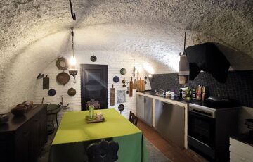 Az épület egy része földben lévő, földdel borított, vastag kő falakból álló pince. Ebben a részben található az étkező- konyha fa tüzeléses búbos kemence, egy kádas fürdőszoba és egy tároló.