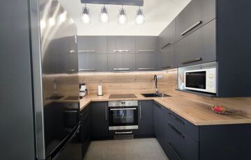 - Konyha igényes, modern beépített konyhabútorral, beépített gépekkel: Bosch mosogatógép, Elektrolux sütő és indukciós főzőlap, páraelszívó.