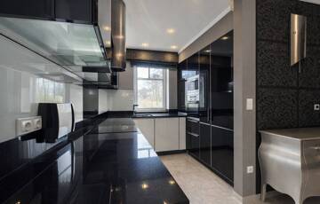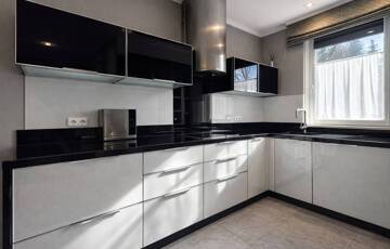 - Egyedi olasz konyhabútor üveg frontlapokkal, fekete gránit pulttal, beépített háztartási gépekkel